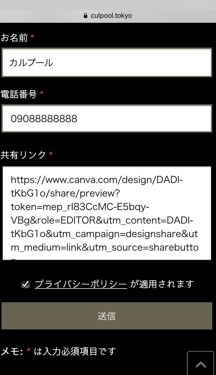 3. この画面下のフォームのメッセージ欄にコピーしたリンクを貼り付ける(本人確認のためお名前と電話番号も入力してください。入力いただいた情報は本人確認以外の用途では利用しません)。