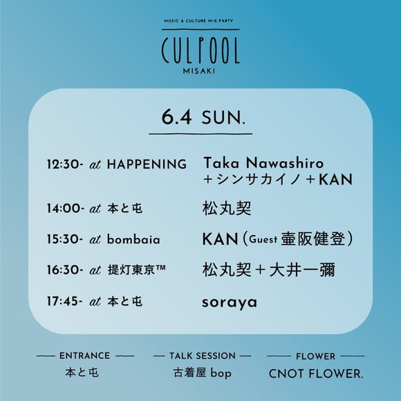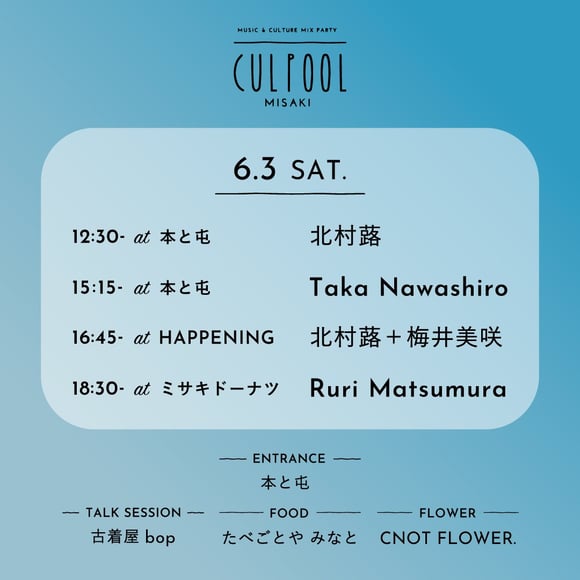 レトロでローカルな港町と移住してきたクリエイターや個性あふれる店舗のオーナーたちによる表現が混ざり合い、ネオローカルで魅力的なスポットとなっている三崎。そんな三崎でローカル x 編集 x 出版を軸に、場づくりやメディアを創出している「アタシ社」を強力なパートナーに迎え、注目の店舗でCULPOOLがキュレーションする新世代の音楽家たちがライブを行います。